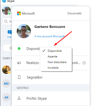 - Adesso ti trovi nella schermata principale. Sulla tua sinistra troverai i tuoi contatti, noterai sicuramente che vicino ad alcuni contatti ci sarà un pallino verde o giallo o è assente del tutto. Verde vuol dire che è online, giallo assente o non al PC, se invece è assente è offline. Per impostare il proprio stato basta cliccare in alto a destra sulla foto del proprio profilo, quindi su disponibile, si aprirà una finestra dove potete scegliere il vostro stato.
